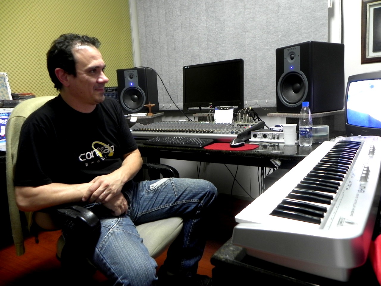 O músico e produtor Sandro Vieira com seus instrumentos de trabalhos: teclado, computador e aparelhagem sonora (Foto: Carol Govari Nunes)