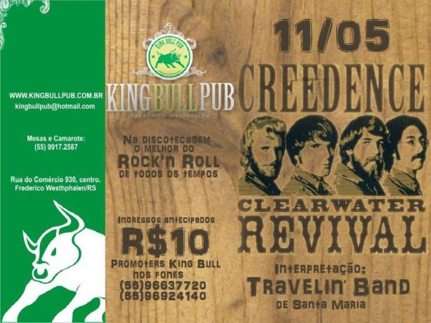 A Travelin’ Band, de Santa Maria, interpreta os clássicos da banda Creedence Clearwater Revival. No violão e vocal tem Vinicius Brum, Lello Insanum na bateria, Adriano Taques/Maurício Brum no baixo e Nareo Lucas de David na guitarra. Na discotecagem “o melhor do rock and roll de todos os tempos”. Os ingressos antecipados custam R$10 e, segundo os promoters, já estão acabando.