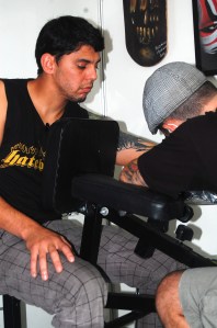 Rodrigo Moraes fazendo a tatuagem de Rafael (Foto: Natalia Nissen)