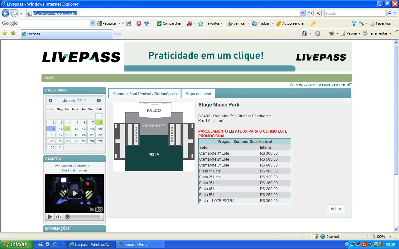 Comprei meu ingresso antecipadamente pelo site LIVEPASS -fiz a compra no dia 25/11, osingressos começaram a ser vendidos no dia 23 – e já no segundo lote, optei pelo camarote, pois segundo o site do LIVEPASS o mapa deixava claro que o camarote era NA FRENTE DO PALCO, separado da pista, que começaria logo atrás… Paguei o equivalente a R$ 575,00, R$ 500 do ingresso e R$ 75 de taxa. O que me levou a adquirir o camarote foi o local privilegiado que ele abarcaria e assim o fiz.