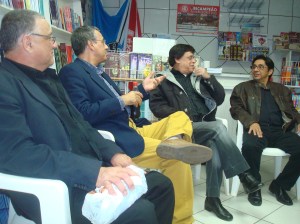 Chegamos à Feira do Livro correndo e improvisando. Improvisando cartão, improvisando pergunta e improvisando equipamento, já que tudo o que tínhamos eram dois celulares e uma câmera digital. Depois de dar uma visualizada no local, soube que aquele homem de camiseta vermelha parado na porta do camarim improvisado na banca de jornal era Felipe Bier, assessor da Jazz 6. Imediatamente, fui até ele. Me identifiquei, entreguei o cartão do blog e disse que queria fazer algumas perguntas aos integrantes da banda. Felipe disse que dependia da disposição de Verissimo, pois ele já tinha concedido uma coletiva de imprensa no hotel onde todos estavam hospedados. Sem problemas. Enquanto esperava alguma resposta, fiz um sinal para Josefina e Débora, que vieram com nossa câmera e nosso microfone (do celular).